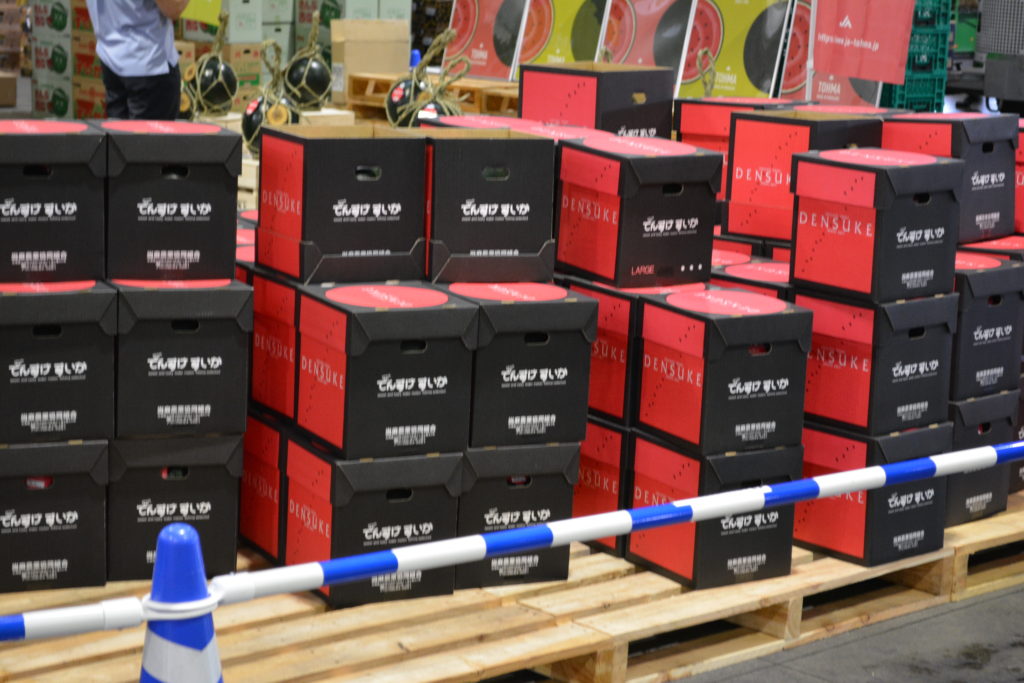 今日は贈答品で人気の高い、でんすけ西瓜、富良野メロンの初セリが行われました。