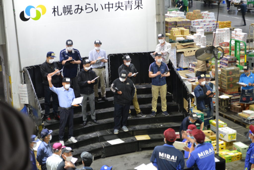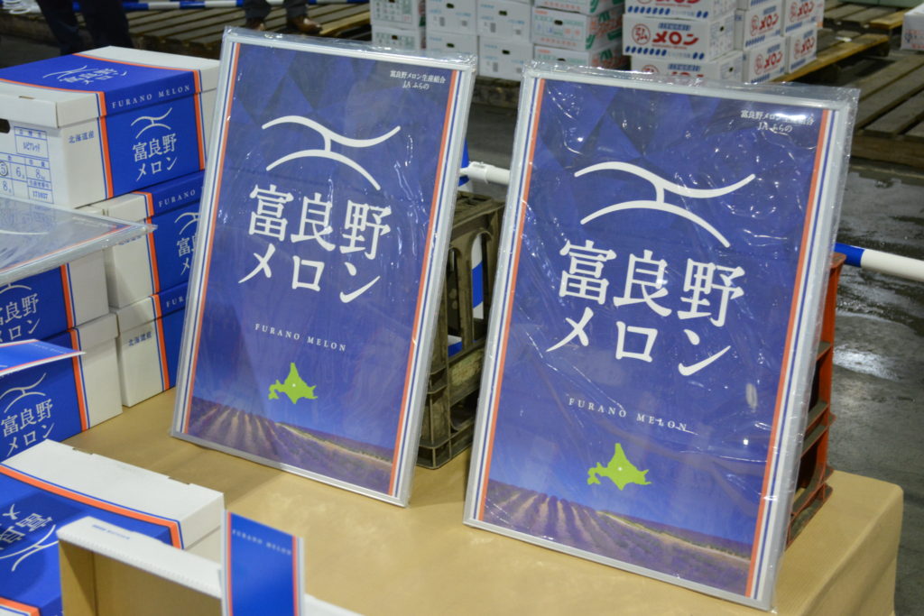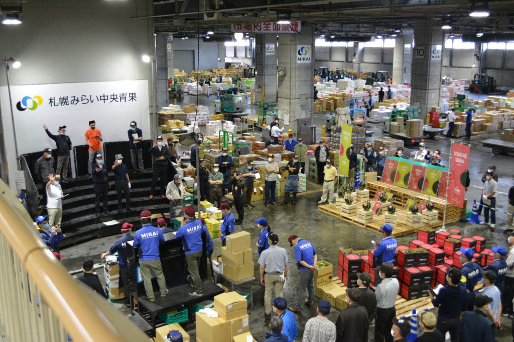 新型コロナウィルスの影響で、フェイスガードやマスクをしてのセリを行っています。例年でんすけすいかは8月中旬頃、富良野メロンは9月上旬頃まで収穫されています。